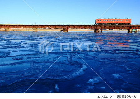 釧網本線釧路川橋梁 蓮の葉氷の川面に写してたらこ色のキハ40単行気動車が行く 根室本線