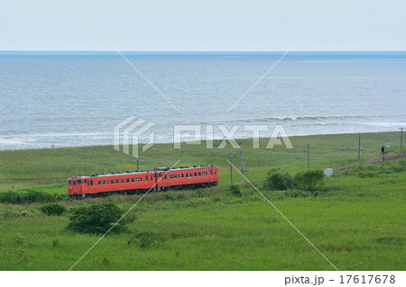 日本海とトンネルを出る五能線の列車 青森県深浦町