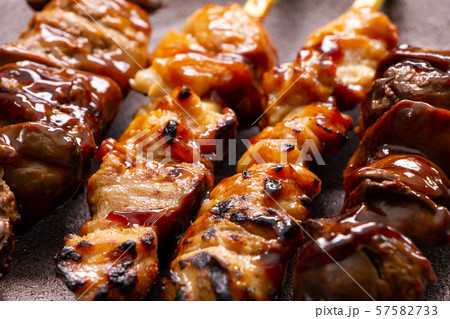 焼鳥(たれ焼き)盛り合わせのアップ。(鶏もも・鶏レバー)