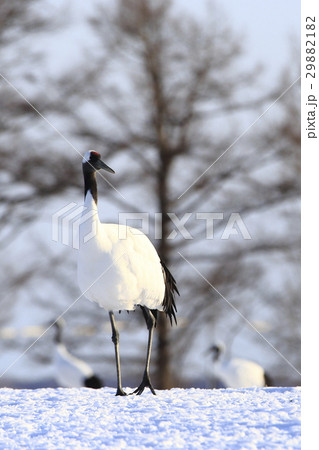 青空を背景に雪原にたたずむタンチョウ(北海道・鶴居)