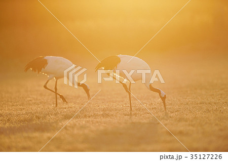 逆光の朝日で輝くタンチョウのペア(北海道・鶴居)