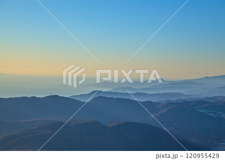 冬の朝の神奈川県 箱根駒ヶ岳ロープウェー 駒ヶ岳頂上から南側の眺望(大観山,十国峠,大室山,相模湾な