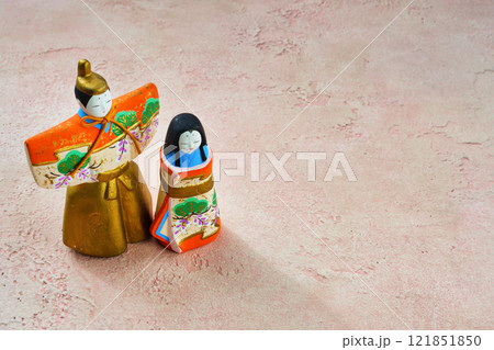 ピンク背景のひな人形(向かって左が女雛、右に男雛)コピースペース有り