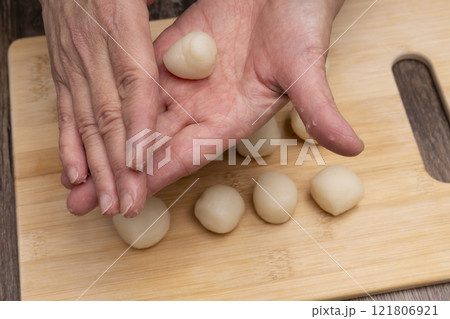 上新粉で団子を作る 蒸した団子を切って丸める