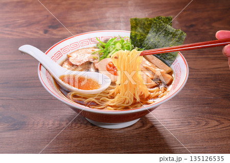 注)湯気は合成です。箸で麺を持ち上げる。ラーメン、醤油らーめん、しょう油拉麺、中華そば。