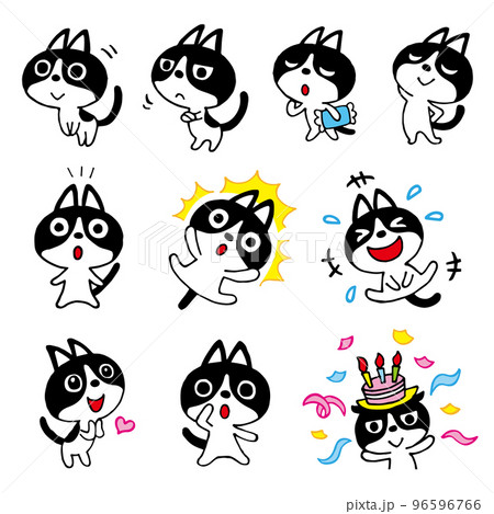 ハチワレネコのゆるい手描きポーズBセット4 ベクター素材