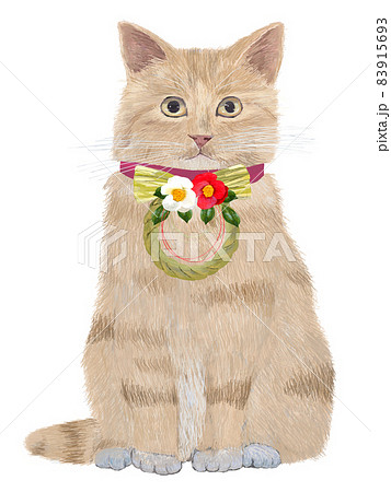 茶トラ猫正面お座りしめ縄_リアルタッチ_縦