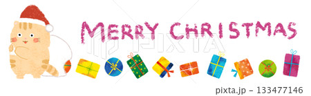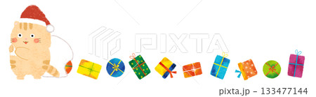 ねこのサンタクロースとプレゼント 飾り罫 クレヨンタッチ