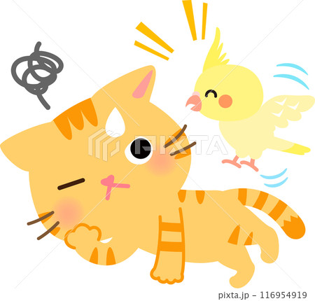 寝ている猫にちょっかいを出すオカメインコ
