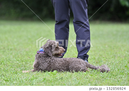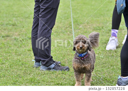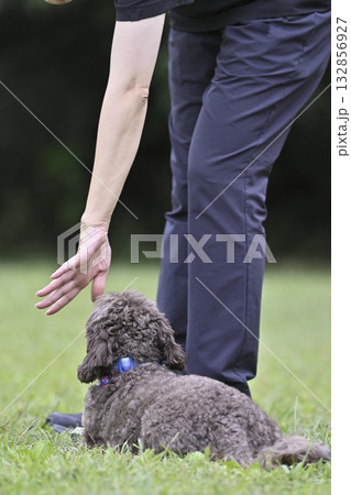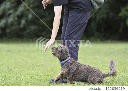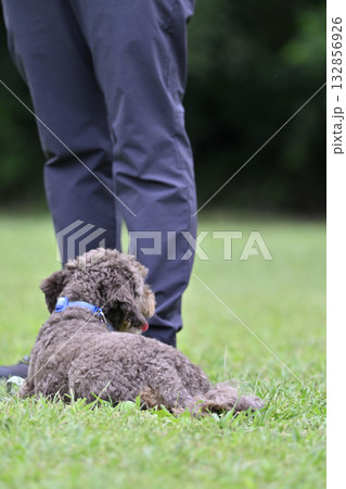ドッグランで愛犬と遊ぶ女性(フセ・マテ)ちわぷー(チワワ×プードル)