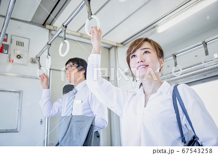 電車で吊り革を掴んでスマートフォンを見る若い女性