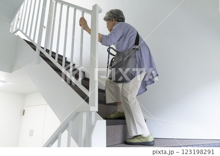 手すりに捕まりながら階段をあがるシニア女性