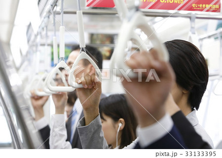 吊革につかまる若い男性