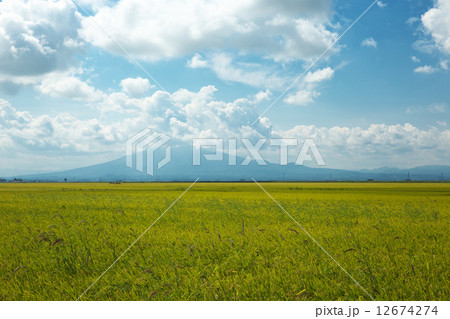 青森県 つがる市の田んぼから望む岩木山と風力発電07