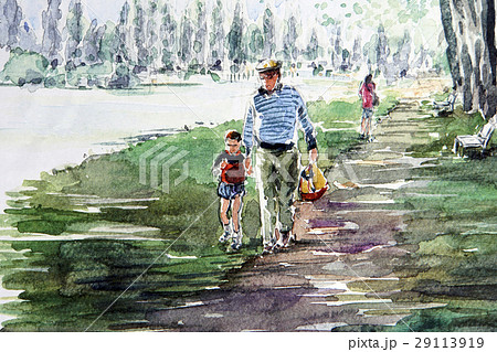 親子で散歩 スケッチ画 家族 女性