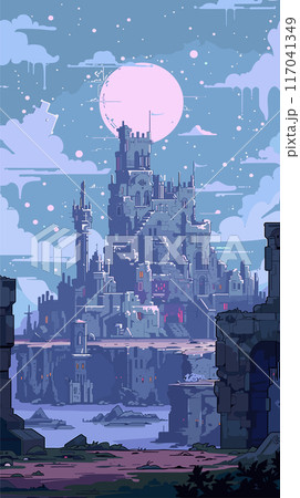Grand towering castle lit moonlight gothic turrets crimson windows. Moonlit sky adorned stars drifting clouds above eerie castle. Mystic architecture isolated white background fantasy universe