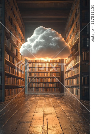 Surreal Cloud Floating in a Dimly Lit Library with Wooden Shelves Filled with Books