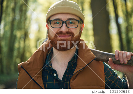 Holding an axe. Bearded man is in the forest at daytime