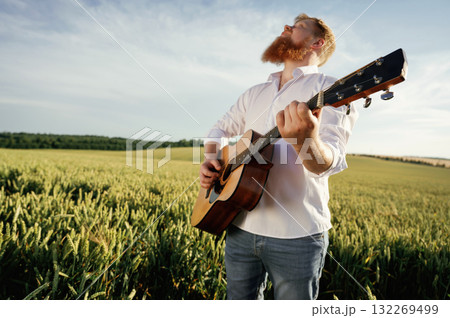 Musician is with acoustic guitar. Man in white shirt is on the agricultural field