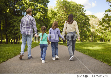 Back view of friendly family holding hands and walking along path in park, enjoying sunny weather