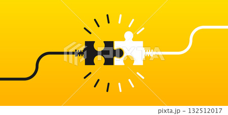 Connecting puzzle pieces on yellow background. Two puzzle pieces with cables coming together. Idea, solution, business, strategy concept. Vector illustration.