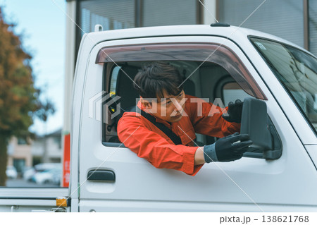 軽トラに乗るつなぎ姿の男性