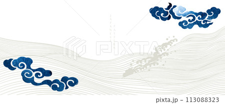 Blue brush stroke texture with Japanese ocean wave with Chinese cloud pattern in vintage style. Abstract art landscape banner design with watercolor texture vector. Hand drawn line.