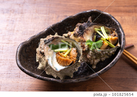 貝類、巻き貝、一品料理、七輪、海の幸、シーフード、日本料理、一品、墨、手書き、筆書き、炉端焼き、