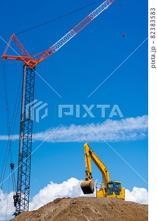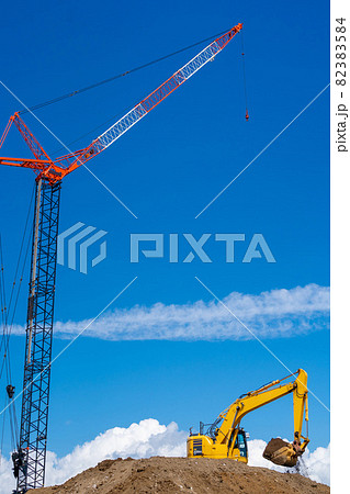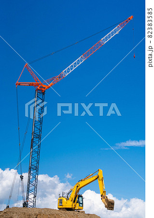 クローラークレーン 油圧ショベル 青空