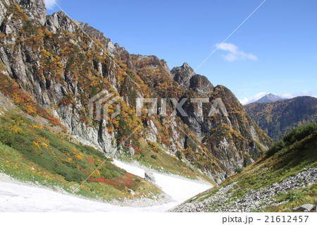 剱岳の錦の衣のような紅葉と剱沢の雪渓