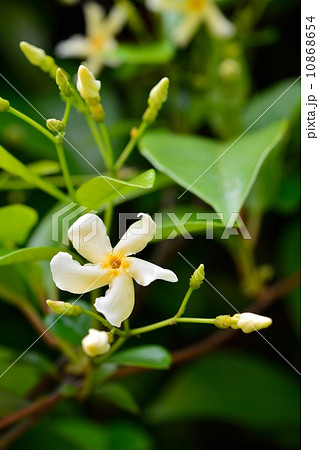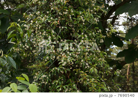 木にからんで伸びる、甘い香りのテイカズラの白い花