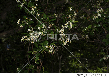 木にからんで伸びる、甘い香りのテイカズラの白い花