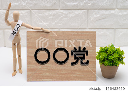 政党名のタスキを掛けた選挙の候補者と政党の看板