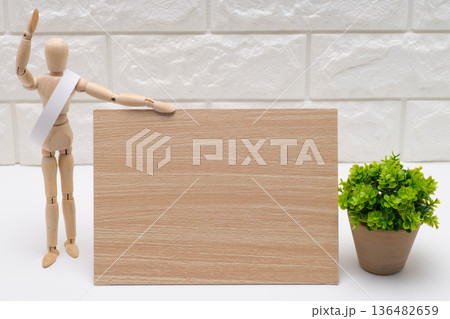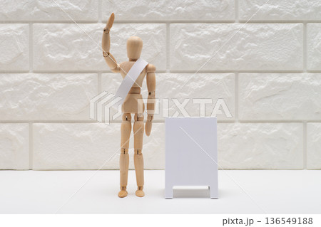 タスキを掛けた選挙の候補者と木の看板と文字スペース