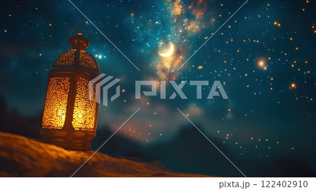 Traditional glowing Arabic lantern with crescent moon view on night scene background. Copy space or mockup. Concept of Eid Al Fitr and Ramadan Mubarak. Islamic background