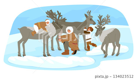 Happy Eskimos family cartoon scene parent milking deer and cute overjoyed kids playing having fun