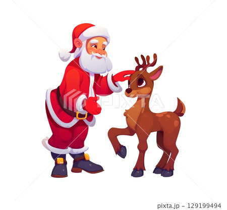 Cartoon Christmas Santa Claus character smiling while gently petting a friendly reindeer. Vector heartwarming festive scene filled with joy and Xmas holiday spirit, seasonal greetings and fun