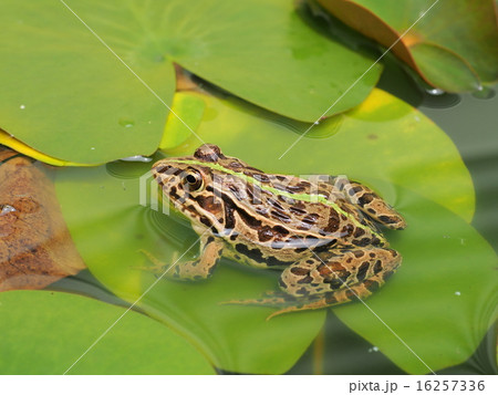 浮かぶ葉っぱの上のトノサマガエル