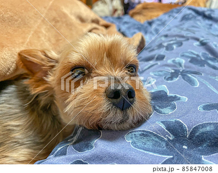 ベッドの上でとぼけた顔をするヨークシャテリア