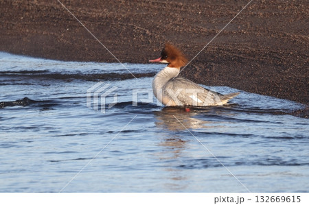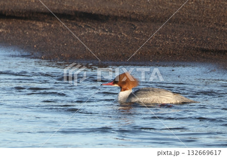 浅瀬に上がったカワアイサのメス