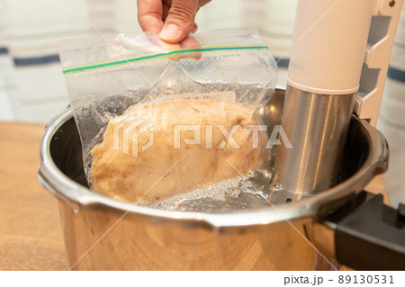 低温調理器で鶏ハムを作っている 鶏肉が入ったフリーザーバッグを見せる