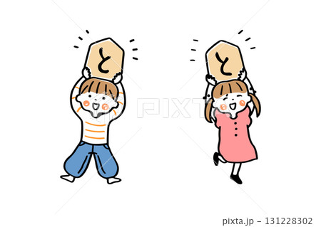 大きな将棋の駒を持つ男の子と女の子(と金)