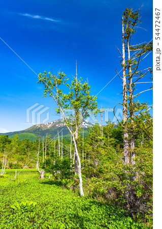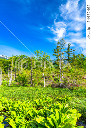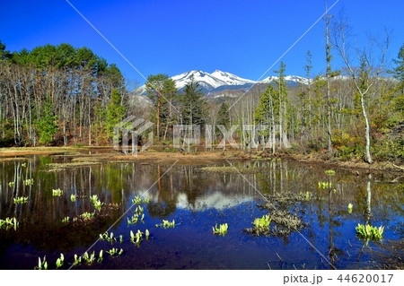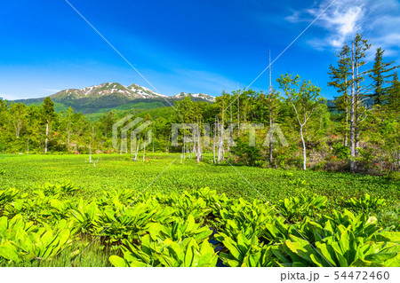 信州の高原 乗鞍高原のどじょう池より乗鞍岳を望む 水芭蕉やミツガシワが咲く6月の風景