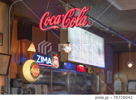 [神奈川・横須賀] アメリカンファストフードで輝くコカ・コーラのネオンサインロゴ。