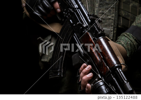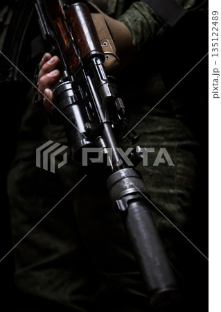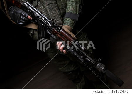 Photo shoot of russia soldier holding machine gun in hands. Man is wearing military uniform.