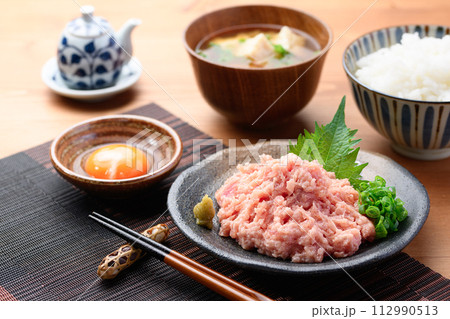 お盆にのせたねぎとろ丼 ( まぐろのたたき丼 )とお味噌汁と漬物