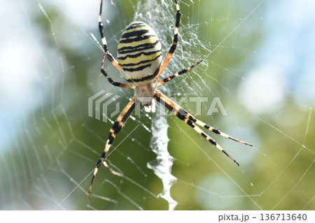 Closeup of exotic striped argiope bruennichi orb web spider sitting on cobweb against blurred background in daytime