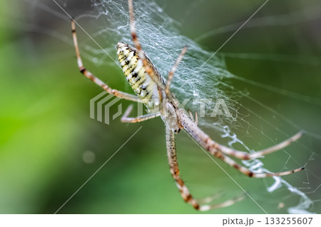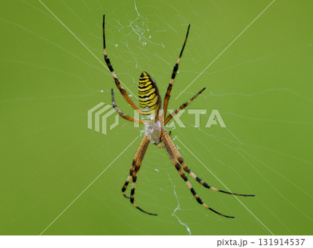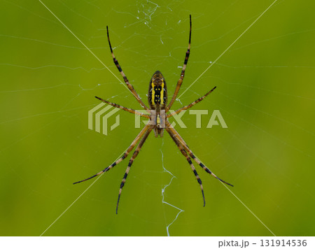 Wasp spider, Argiope bruennichi, in spider web against a green background