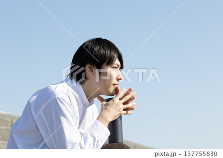 海岸で寛ぐ男性