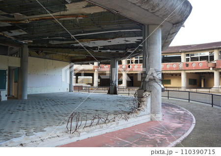 震災遺構大川小学校の校庭と裏山(宮城県石巻市)